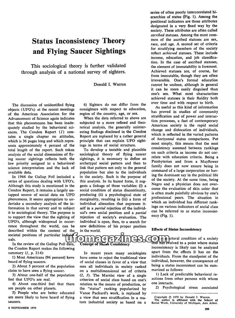 This article by Stuart Appelle challenges D. I. Warren's 1970 argument that "status inconsistency theory" can explain UFO sightings. Appelle contends that Warren's data, derived fr