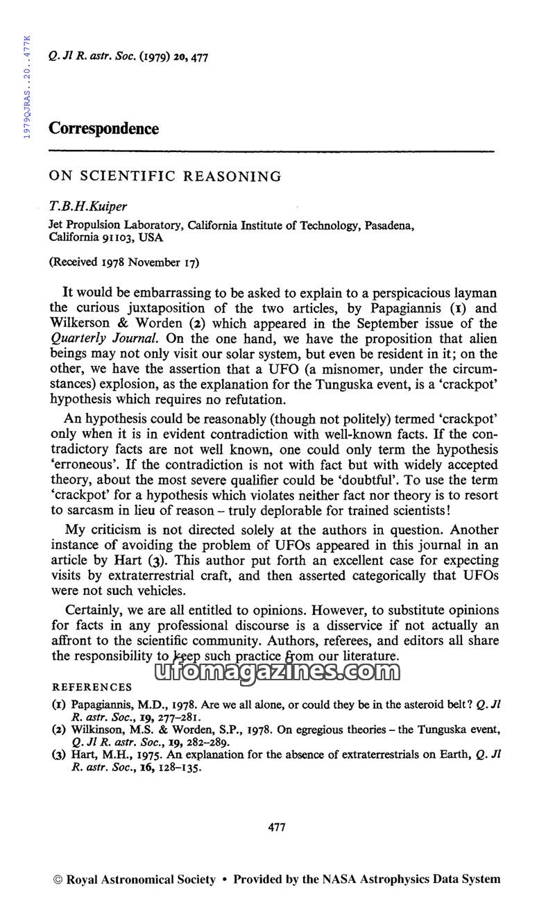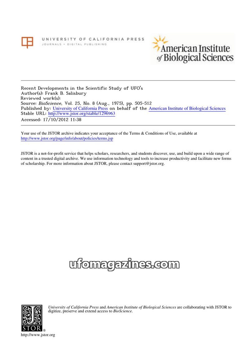 This article from BioScience (1975) by Frank B. Salisbury updates a 1967 piece on the scientific study of UFOs. It notes increased scientific interest and the establishment of orga