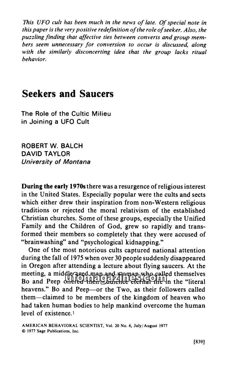 This article examines the Bo and Peep UFO cult, which gained notoriety in 1975 after over 30 followers disappeared in Oregon. The study highlights that conversion to this cult did