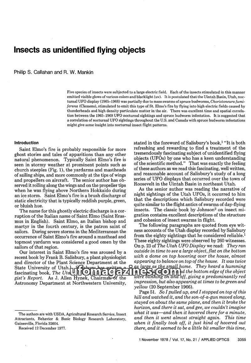 This issue explores the hypothesis that many unidentified flying object (UFO) sightings, particularly daylight ones, may be explained by swarms of insects exhibiting St. Elmo's glo