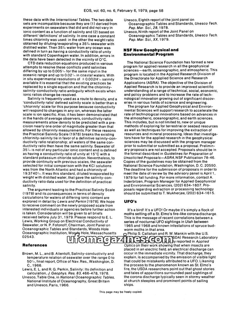 This issue of EOS discusses the proposed Practical Salinity Scale (1978) which aims to resolve ambiguities in salinity definitions and improve density calculations. It also announc