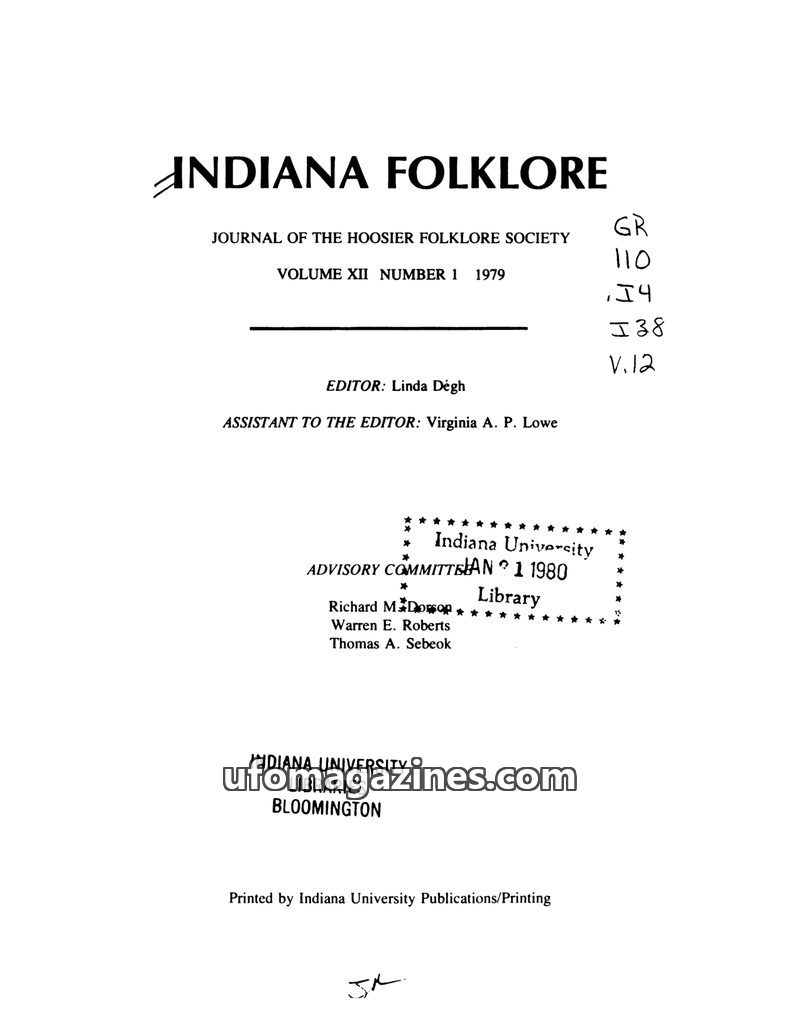 This issue of Indiana Folklore, Volume XII, Number 1 from 1979, focuses on the analysis of legend types, particularly UFO sightings and 'foreign matter in food' narratives. It high