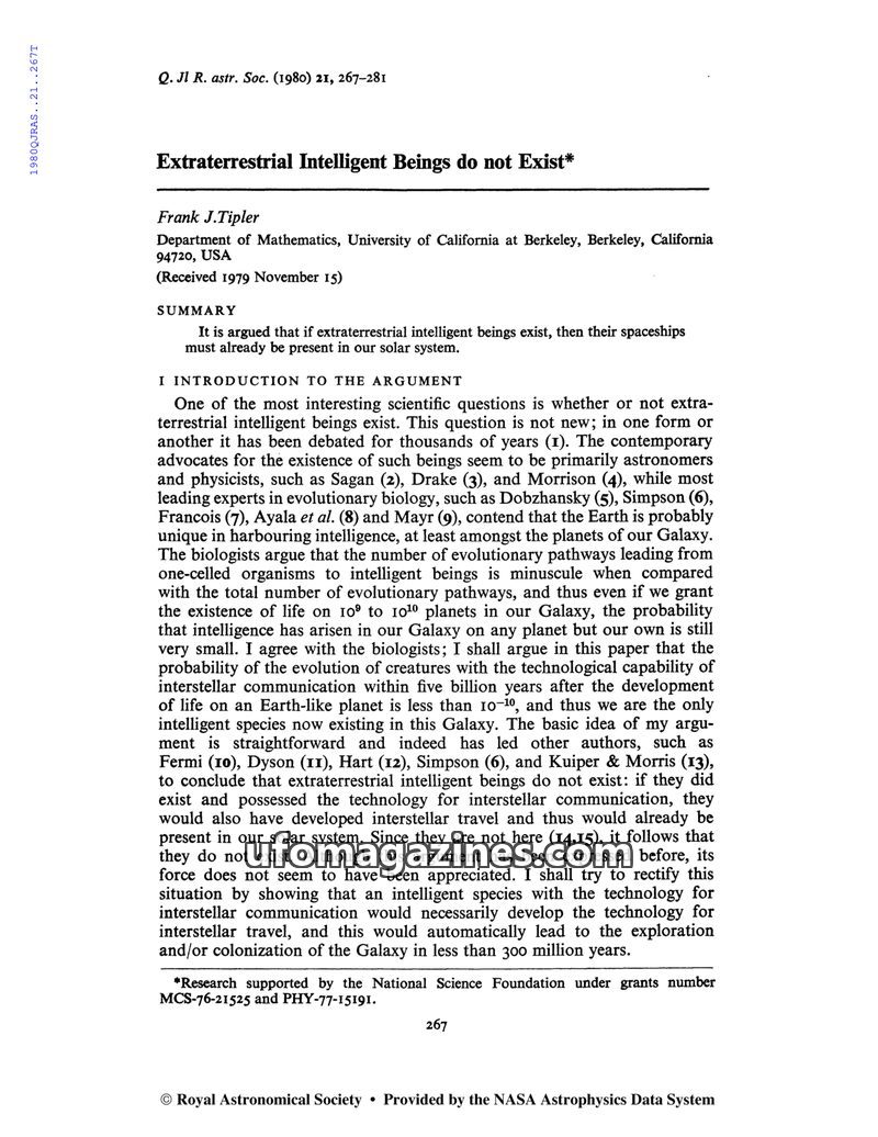 This paper by Frank J. Tipler argues that extraterrestrial intelligent beings do not exist. The core argument is that if such beings possessed the technology for interstellar commu