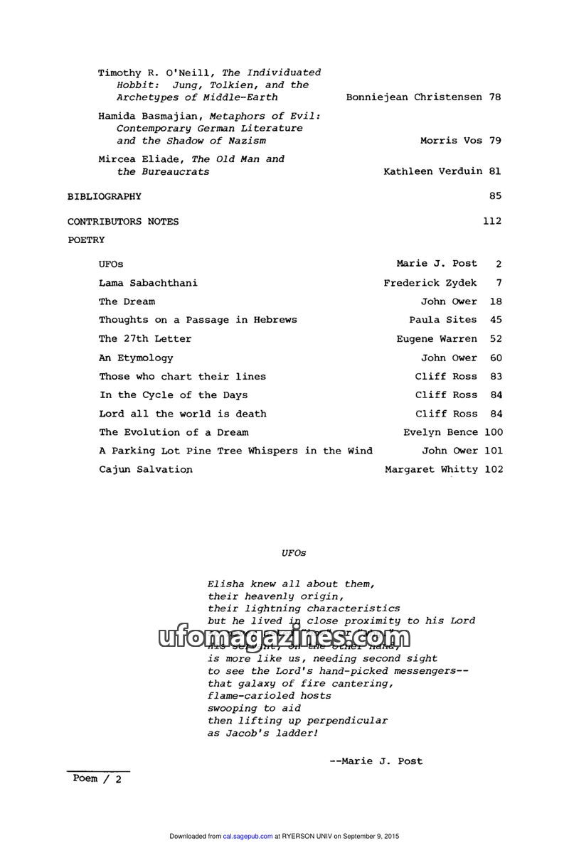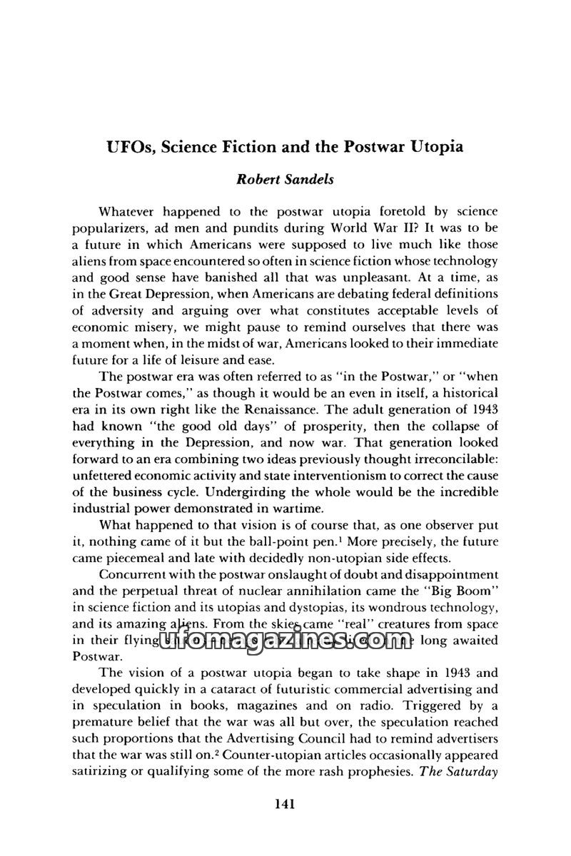 This essay analyzes the Saucerian Press, a mail-order firm central to flying saucer folklore, and its 4,400 customers. It explores the evolution of the UFO movement from contactee