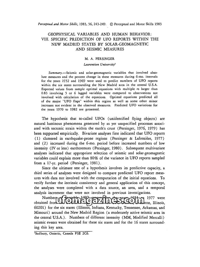 This study by M. A. Persinger investigates the prediction of UFO reports in the New Madrid states using seismic and solar-geomagnetic variables. The research found that optimal equ