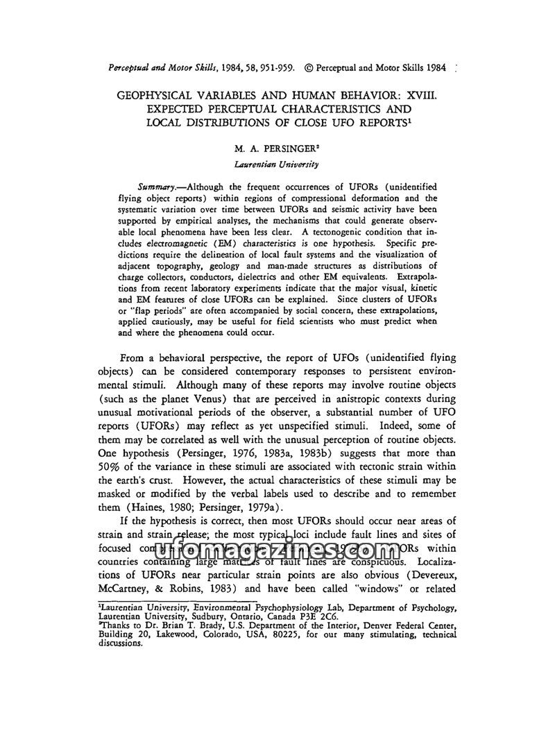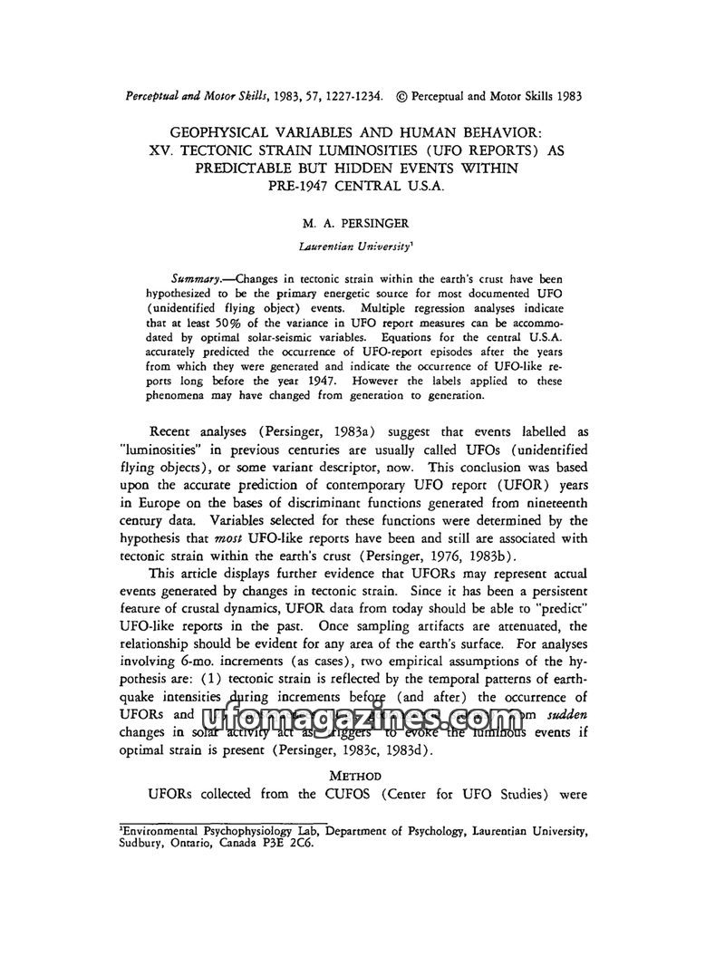 This article by M. A. Persinger proposes that tectonic strain within the Earth's crust is the primary energetic source for documented UFO events. Multiple regression analyses indic