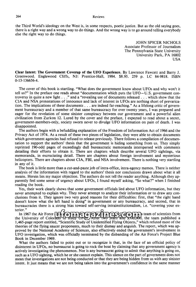 This issue reviews two books: 'Clear Intent' by Fawcett and Greenwood, which compiles government documents related to UFOs but is criticized for lacking analysis and conclusions, a