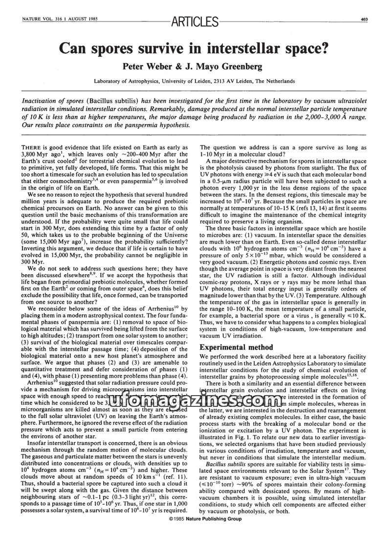 This issue of Nature features research on the survival of Bacillus subtilis spores in simulated interstellar conditions, finding that low temperatures (10 K) and vacuum, combined w
