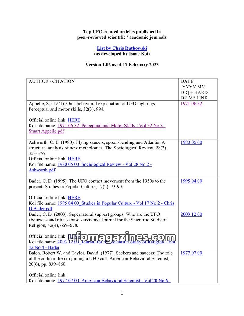 This document is a curated list of academic and scientific articles focusing on UFO-related topics, compiled by Chris Rutkowski and developed by Isaac Koi. It spans a wide range of