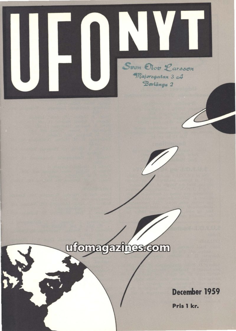 This issue of UFO-NYT from December 1959 delves into various UFO-related topics. It highlights concerns about UFO forgeries and the commercialization of the phenomenon. The magazin