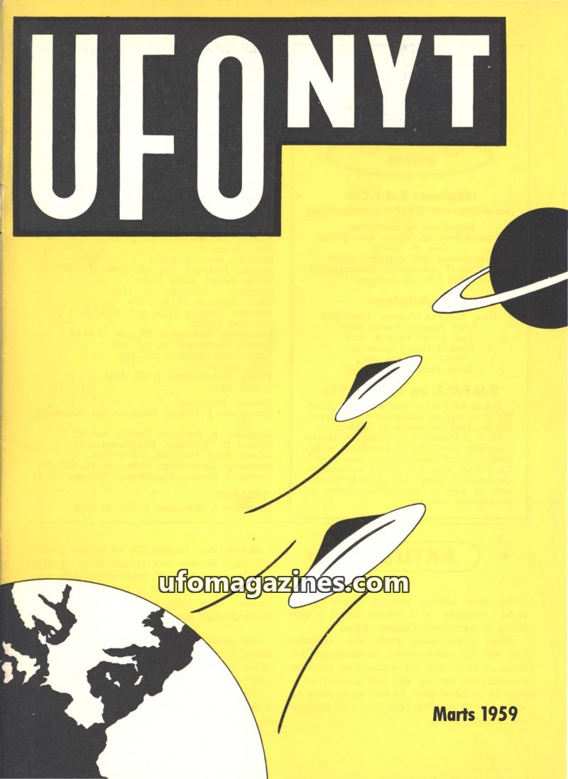 This issue of UFO-NYT from March 1959 focuses on UFO sightings and the ongoing debate surrounding them in Denmark. It includes numerous reports from various observers detailing the