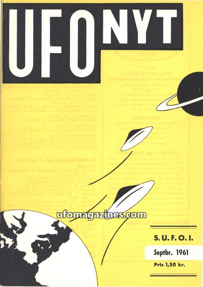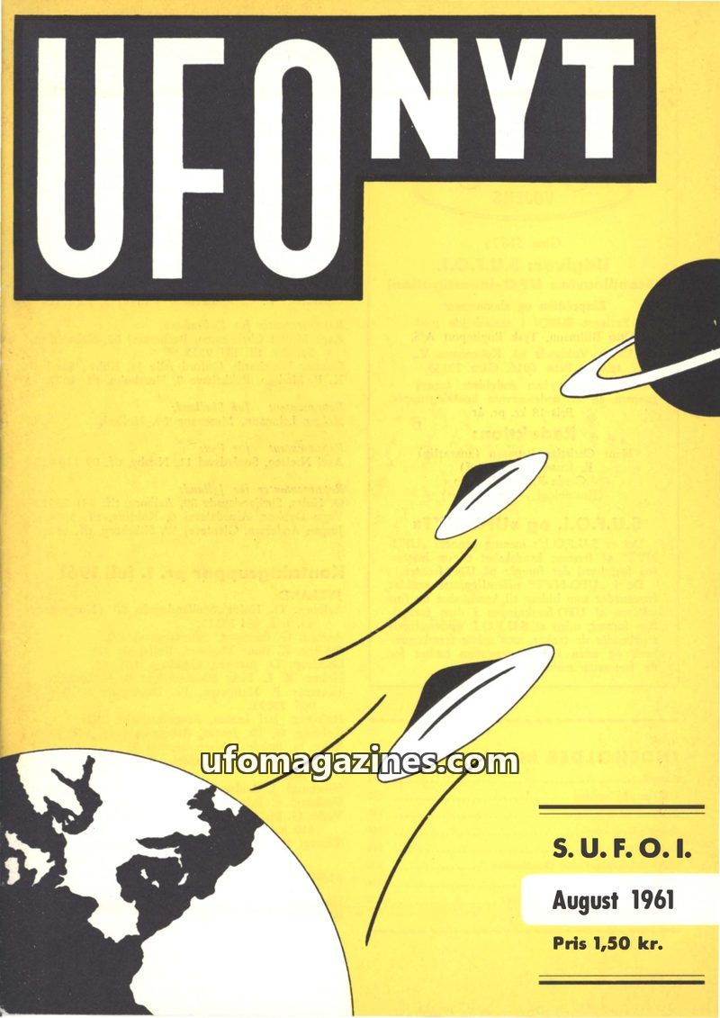 This issue of UFO NYT from July 1961, published by S.U.F.O.I., focuses on UFO investigations and related topics. It includes articles on UFO observations in Scandinavia, a physical