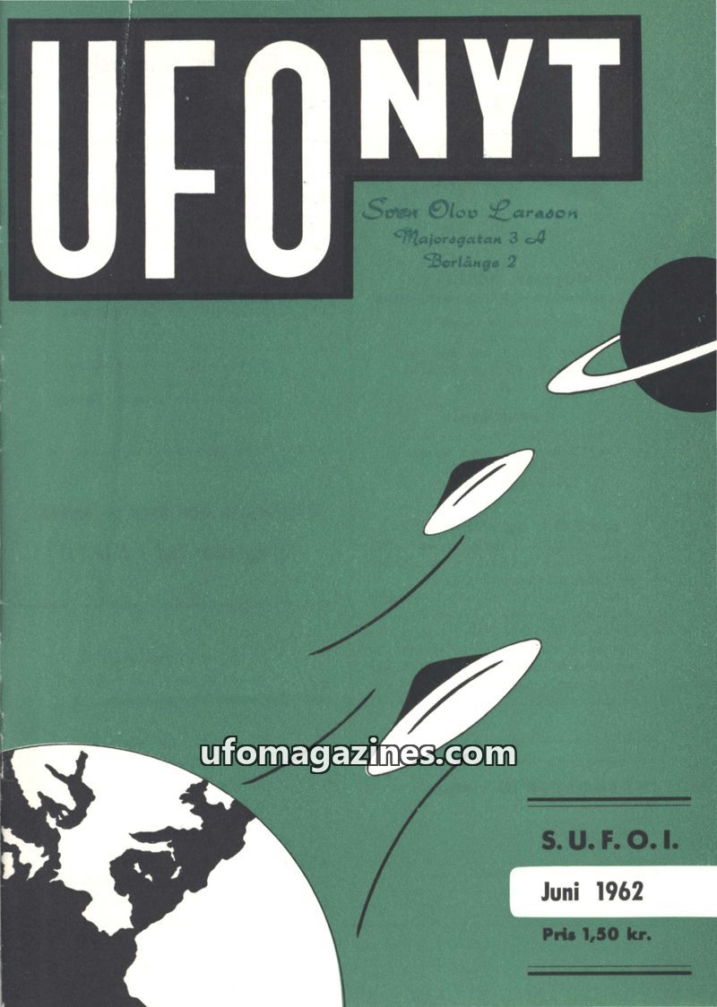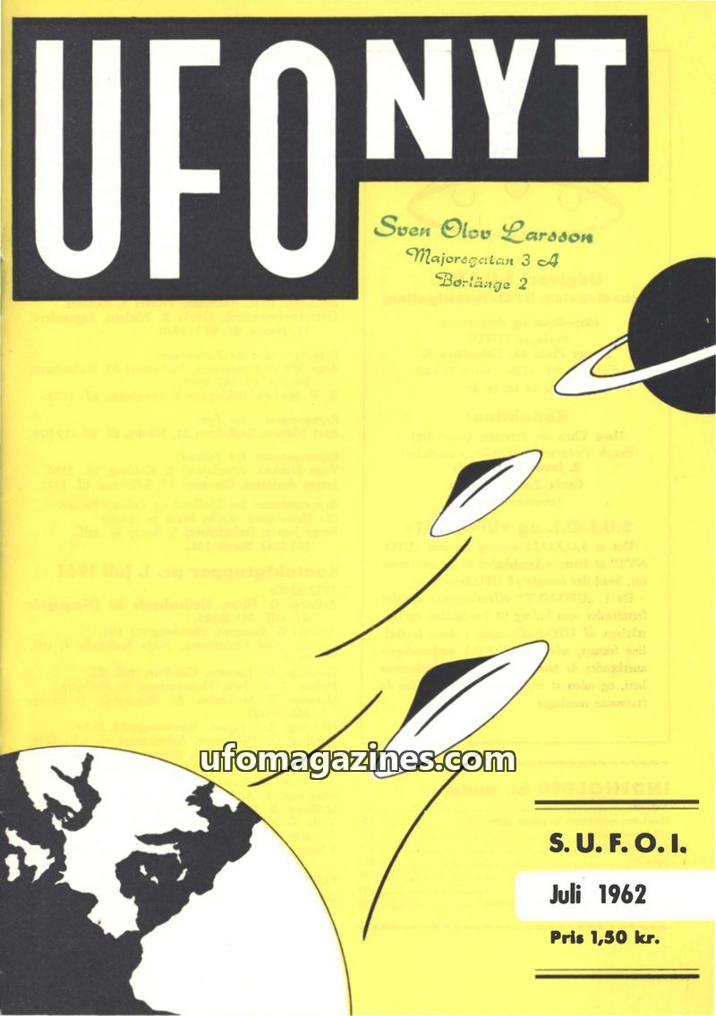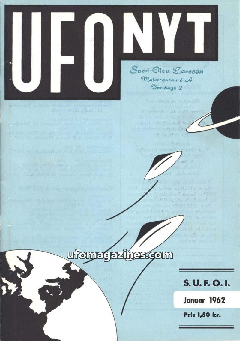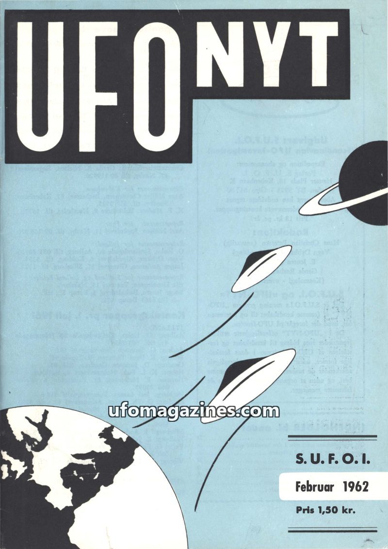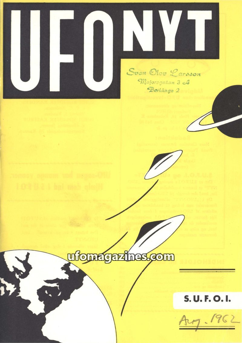 This issue of UFO NYT, published by S.U.F.O.I. in August 1962, focuses on UFO observations in Scandinavia, particularly a notable ten-hour sighting in Frederikshavn. It also delves