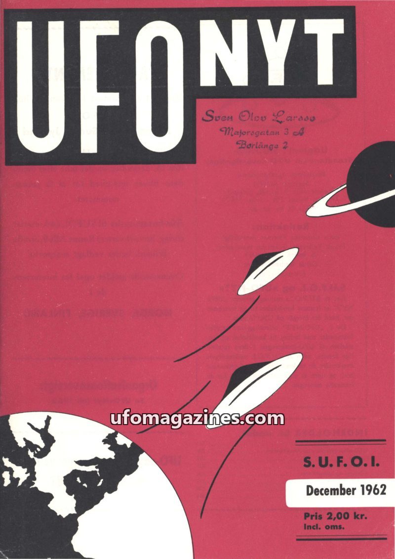 This issue of UFO NYT from December 1962 covers various UFO-related topics. It includes reports of sightings over Scandinavia, discussions on UFO censorship by the USAF, and an ana