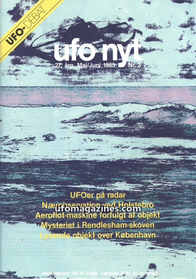 This issue of UFO Nyt from May-June 1985 covers a range of UFO phenomena. It includes a detailed report of an Aeroflot flight near Minsk being pursued by a mysterious green object,