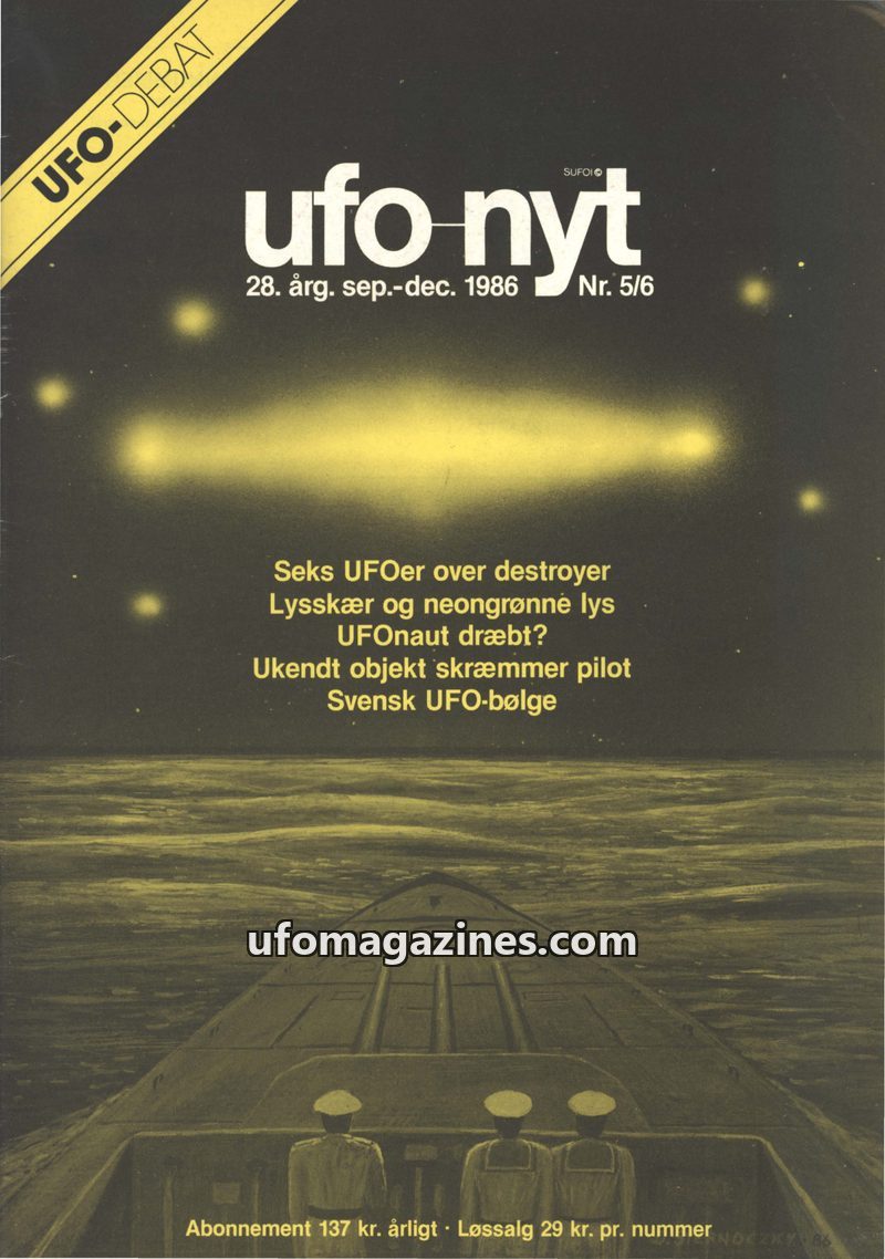 This issue of UFO-NYT from September-December 1986 features a detailed report of a Chilean destroyer crew's encounter with multiple UFOs, including one large object that caused a p