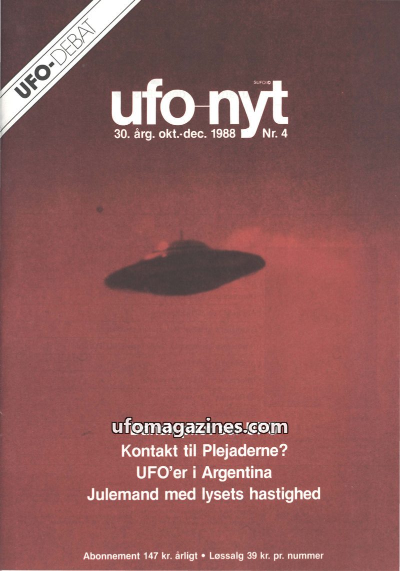 This issue of UFO-NYT from October-December 1988 covers a range of UFO-related topics. It features a Danish pilot's daylight sighting of a silver sphere, an analysis of Eduard Meie