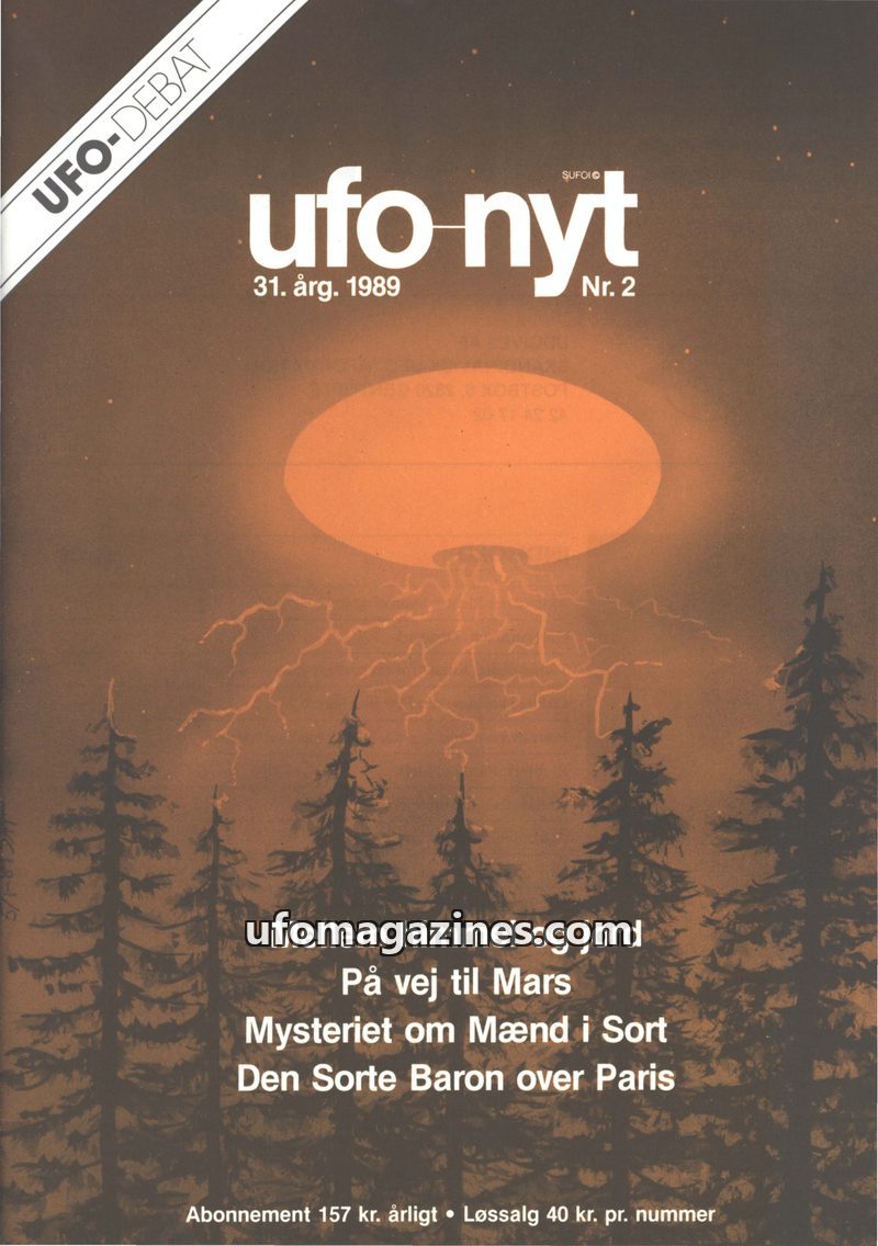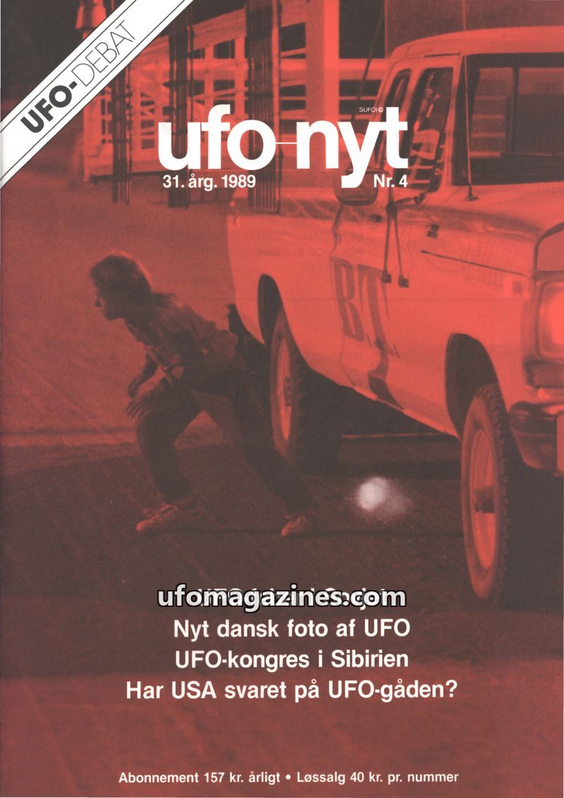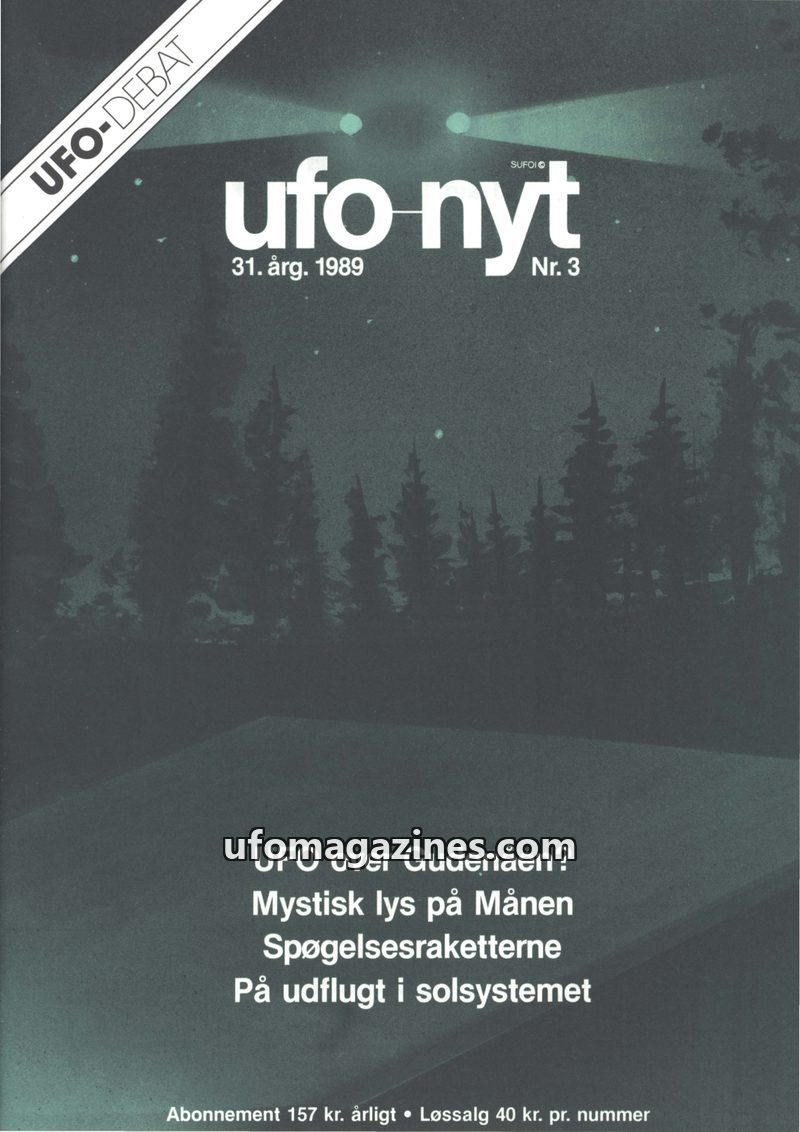This issue of UFO-nyt from Jan-Mar 1989 delves into various UFO phenomena. It features an investigation into a video recording of a light phenomenon, a report on UFO swarms observe