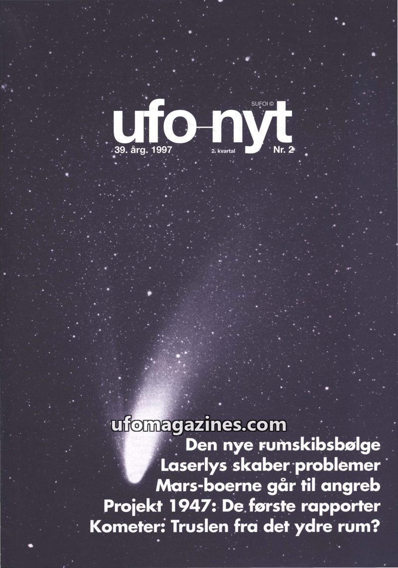 This issue of UFO-Nyt from 1997 discusses the media's focus on UFOs as alien spaceships, contrasting it with SUFOI's more critical stance. It covers the cultural impact of comets,