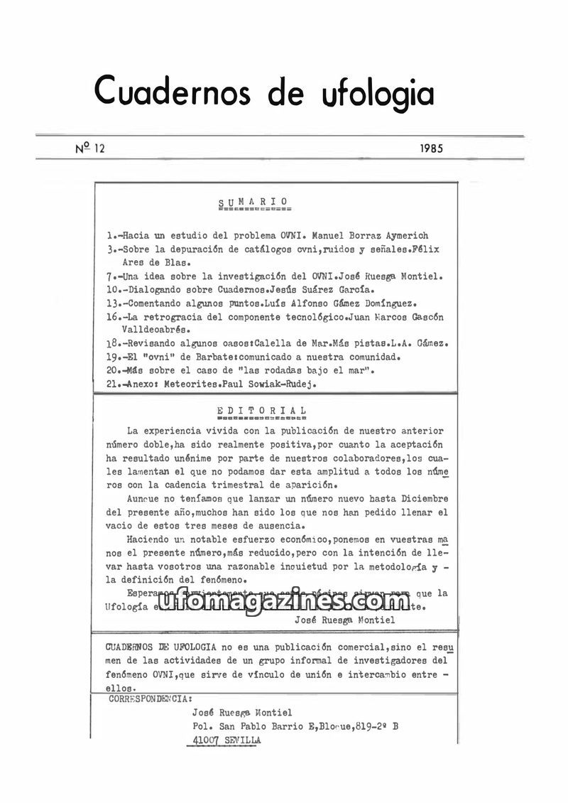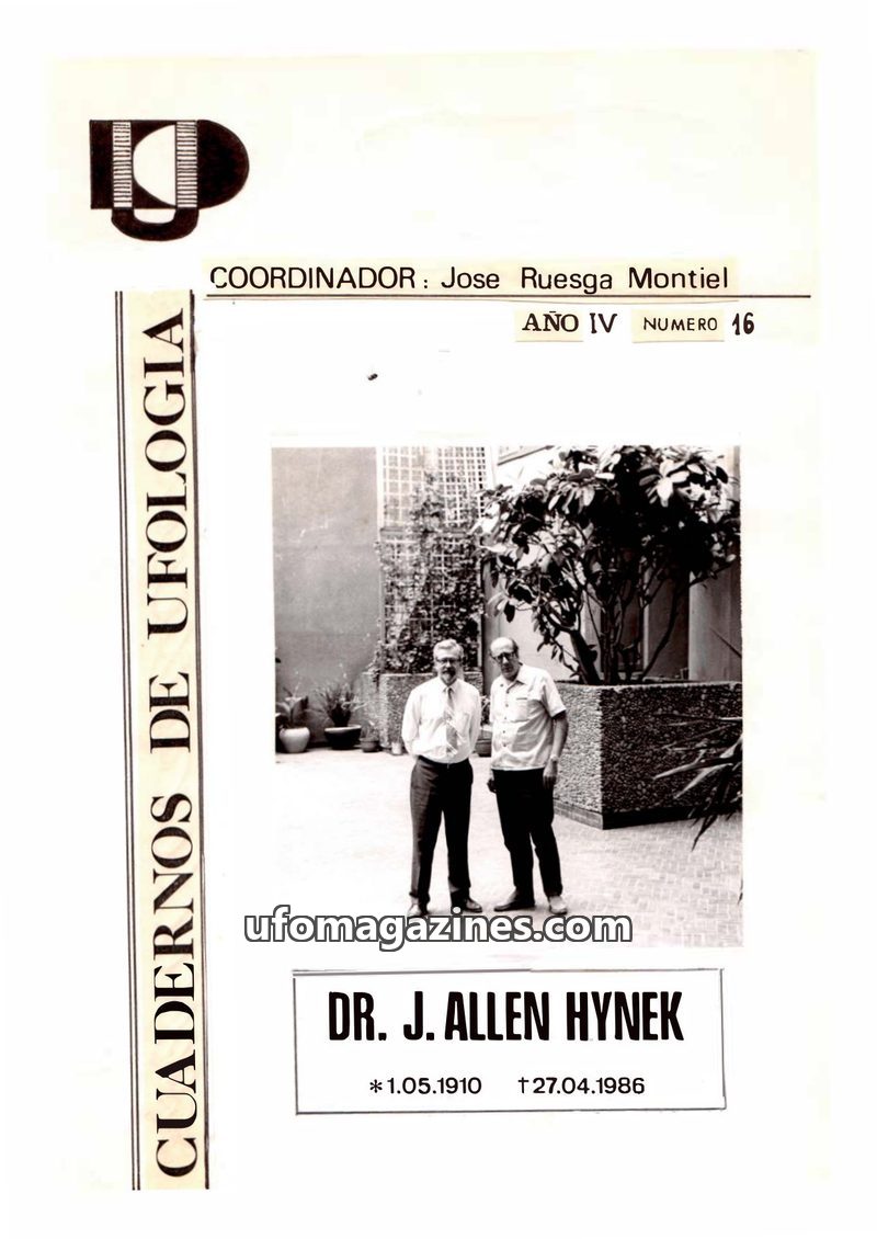 This inaugural issue of 'CUADERNOS DE UFOLOGIA' serves as a communication link for an informal group of UFO investigators in Spain. It announces the passing of veteran investigator