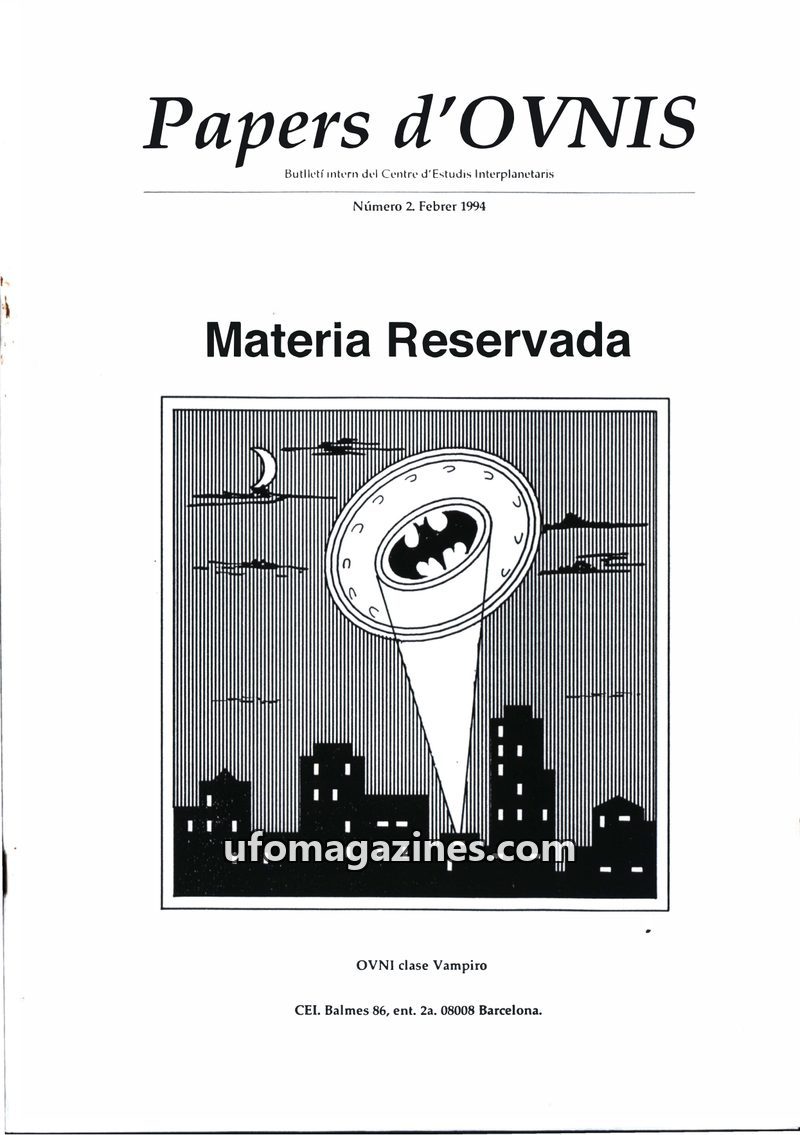 This issue of Papers d'OVNIS, published in February 1994, focuses on 'Materia Reservada' by J.J. Benítez and the criticism it has drawn from the Centre d'Estudis Interplanetaris (C