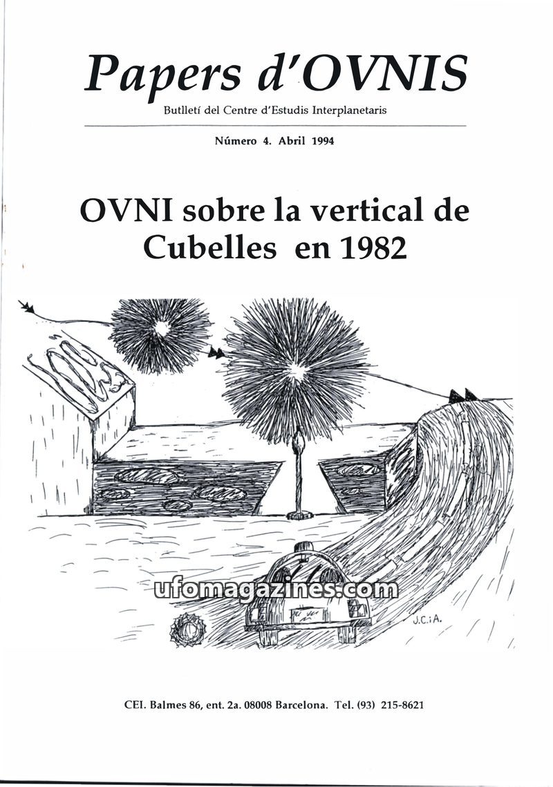 This issue of Papers d'OVNIS, published in April 1994, focuses on a 1982 UFO sighting over Cubelles, Spain, detailed by municipal police. It also revisits a 1975 encounter with a m