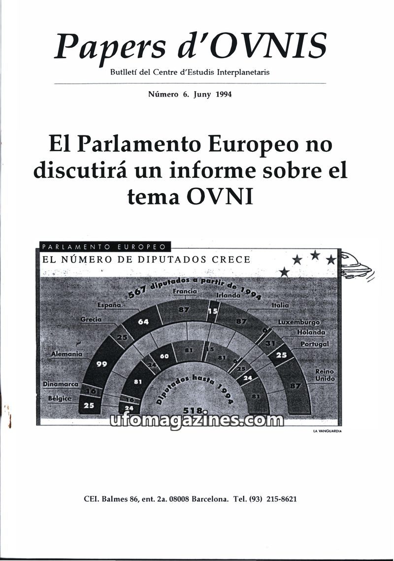 This issue of Papers d'OVNIS discusses the European Parliament's decision not to debate a report on UFOs proposed by MEP Tullio Regge. The magazine criticizes Regge's report for re