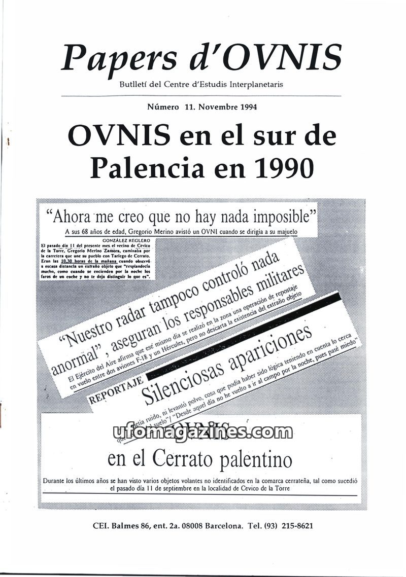 This issue of Papers d'OVNIS focuses on a UFO sighting in Cevico de la Torre, Palencia, on September 11, 1990, witnessed by Gregorio Merino Zamora in broad daylight. The report det