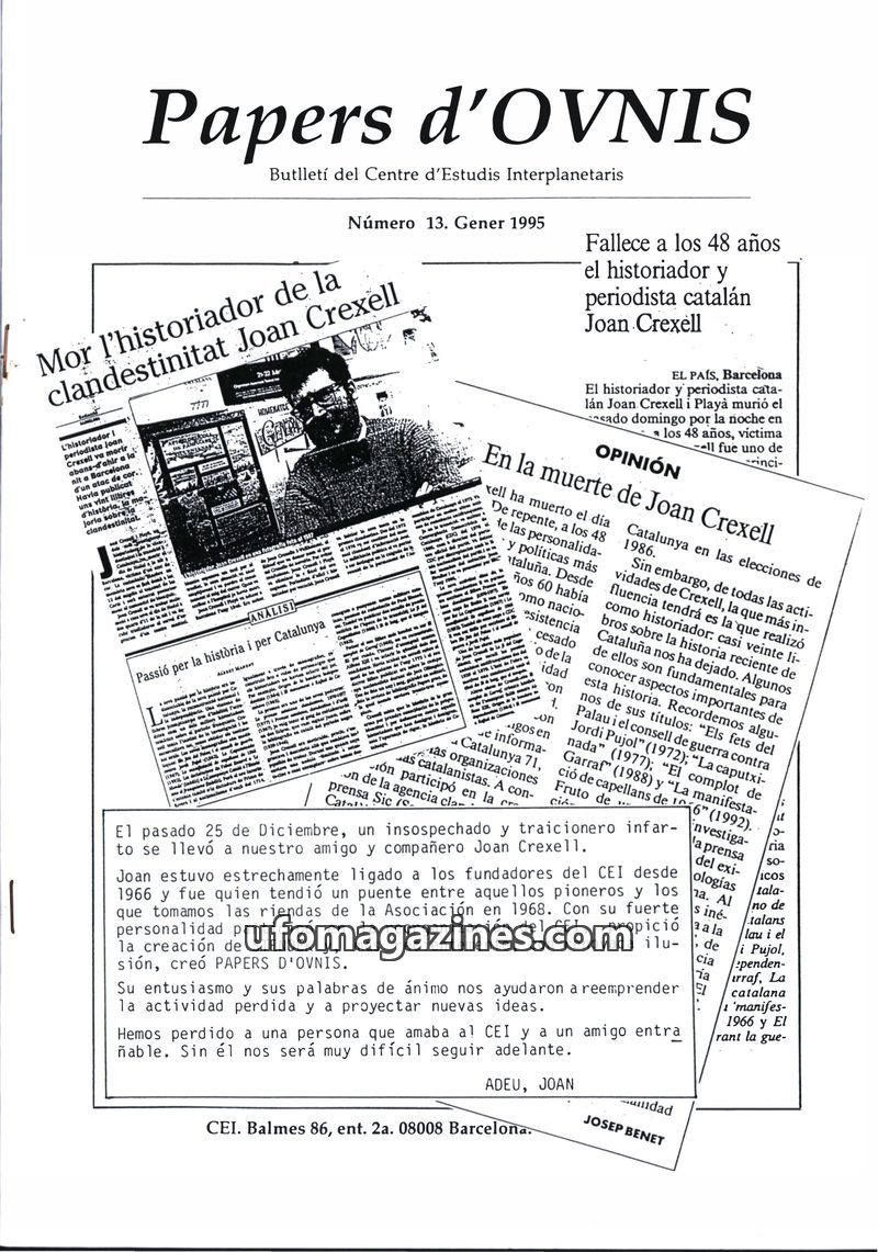 This issue of Papers d'OVNIS features an obituary for Catalan historian and journalist Joan Crexell, who passed away at 48. The magazine also explores the public's preparedness for