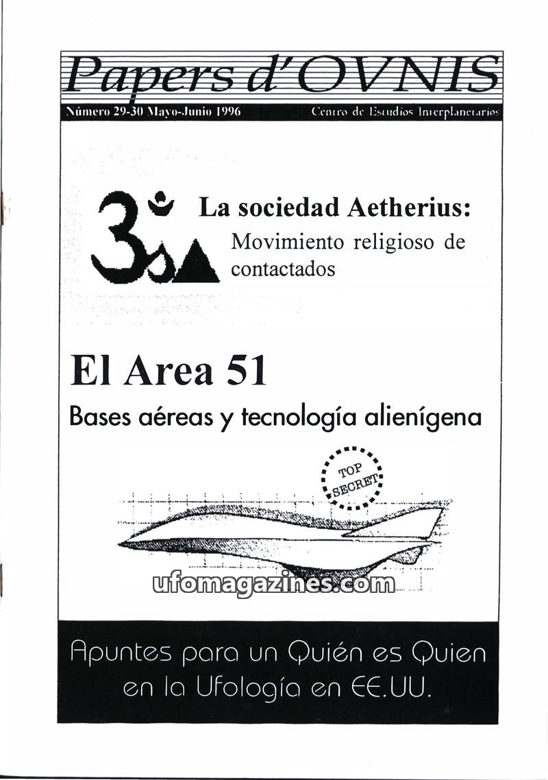 This issue of Papers d'OVNIS delves into the secrets of Area 51, discussing its alleged role in developing alien technology. It also examines the Aetherius Society, a religious mov