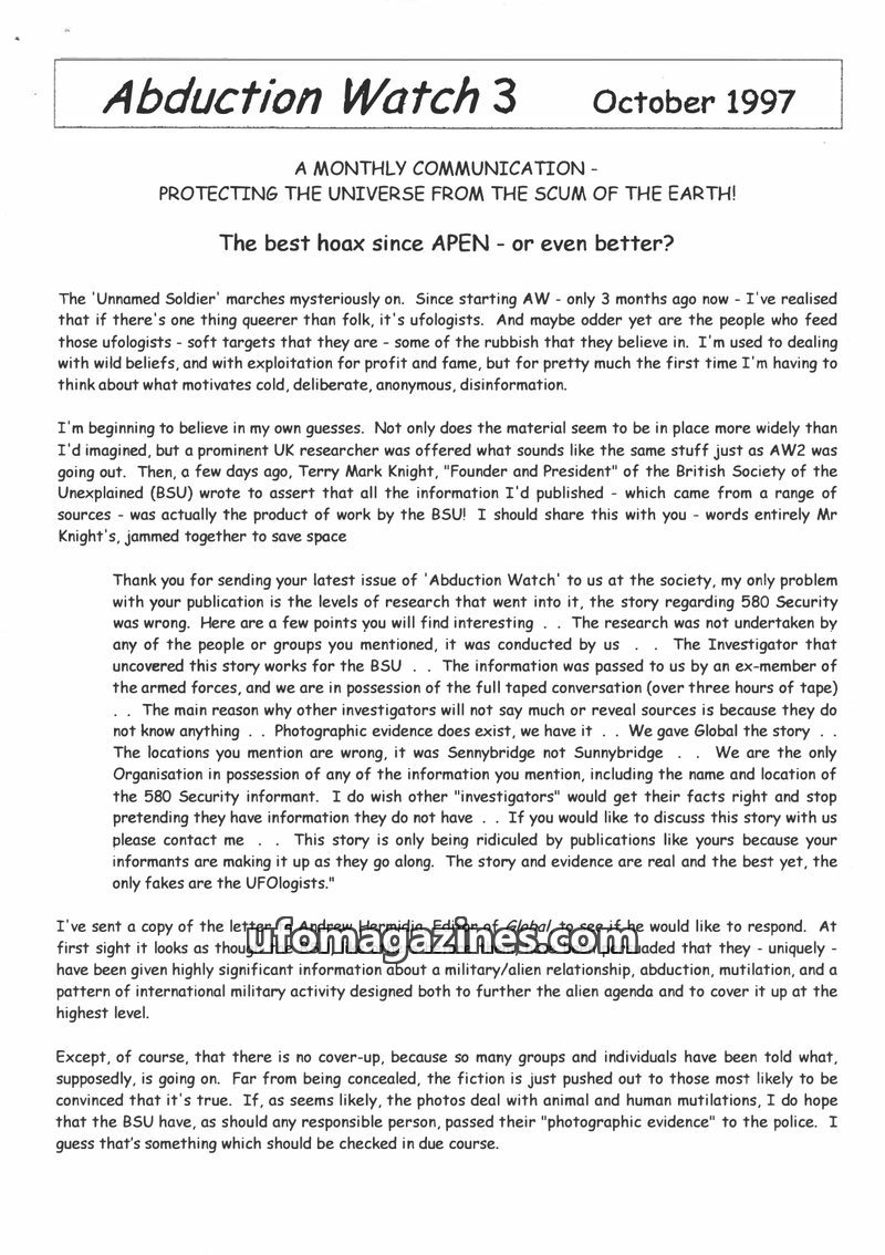 This issue of Abduction Watch critically examines the 'Unnamed Soldier' phenomenon, a purported hoax involving ex-military sources providing information on UFOs and abductions. The