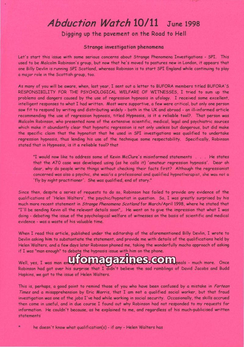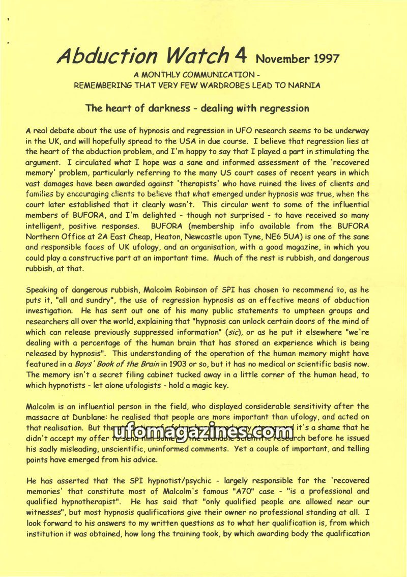 This issue of Abduction Watch critically examines the use of regression hypnosis in UFO research, particularly by Malcolm Robinson and SPI, highlighting concerns about 'recovered m