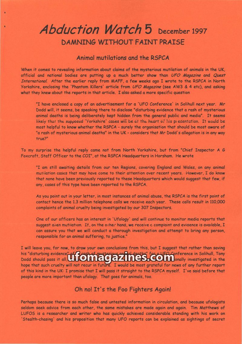 This issue of Abduction Watch investigates claims of animal mutilations in the UK and the RSPCA's response, finding a lack of reported cases. It debunks theories linking UFOs to Na