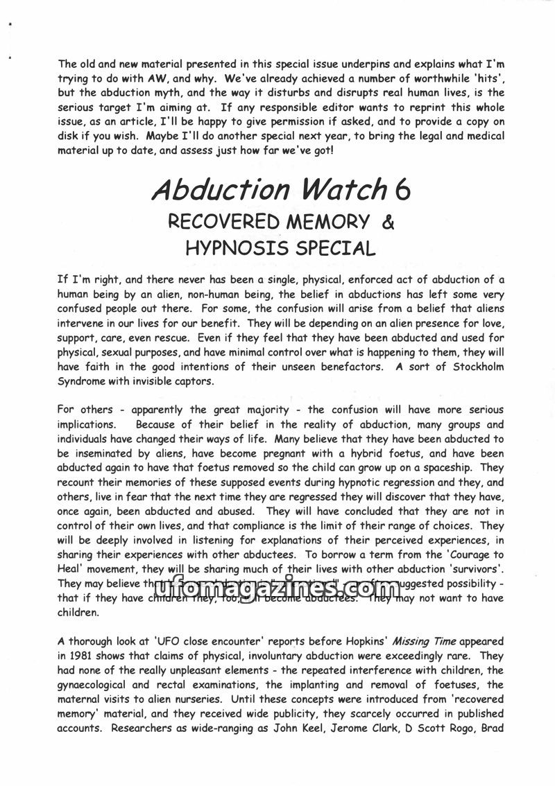 This special issue of Abduction Watch argues that the alien abduction phenomenon is largely a product of recovered memory techniques, particularly hypnosis, rather than actual even