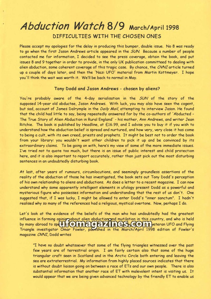 This issue of Abduction Watch critically examines the Jason Andrews abduction case, questioning the claims made by Tony Dodd and the book 'Abducted'. It highlights inconsistencies