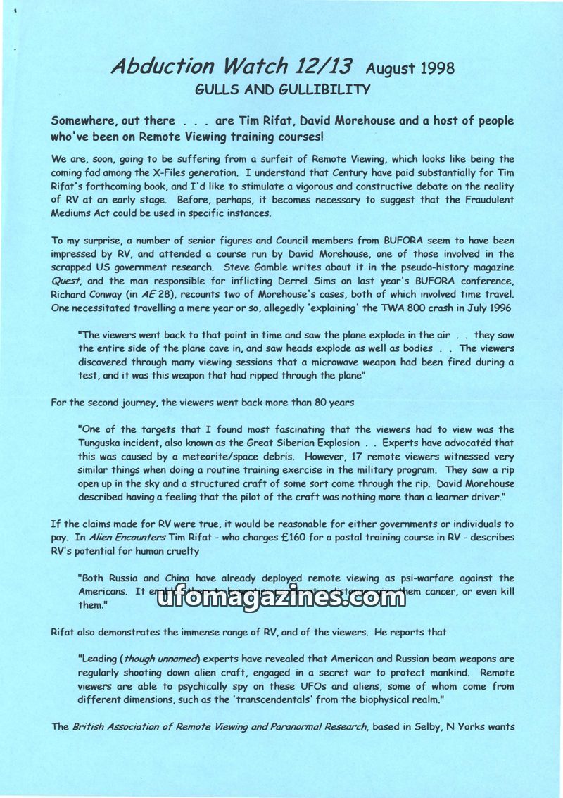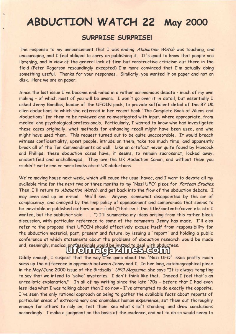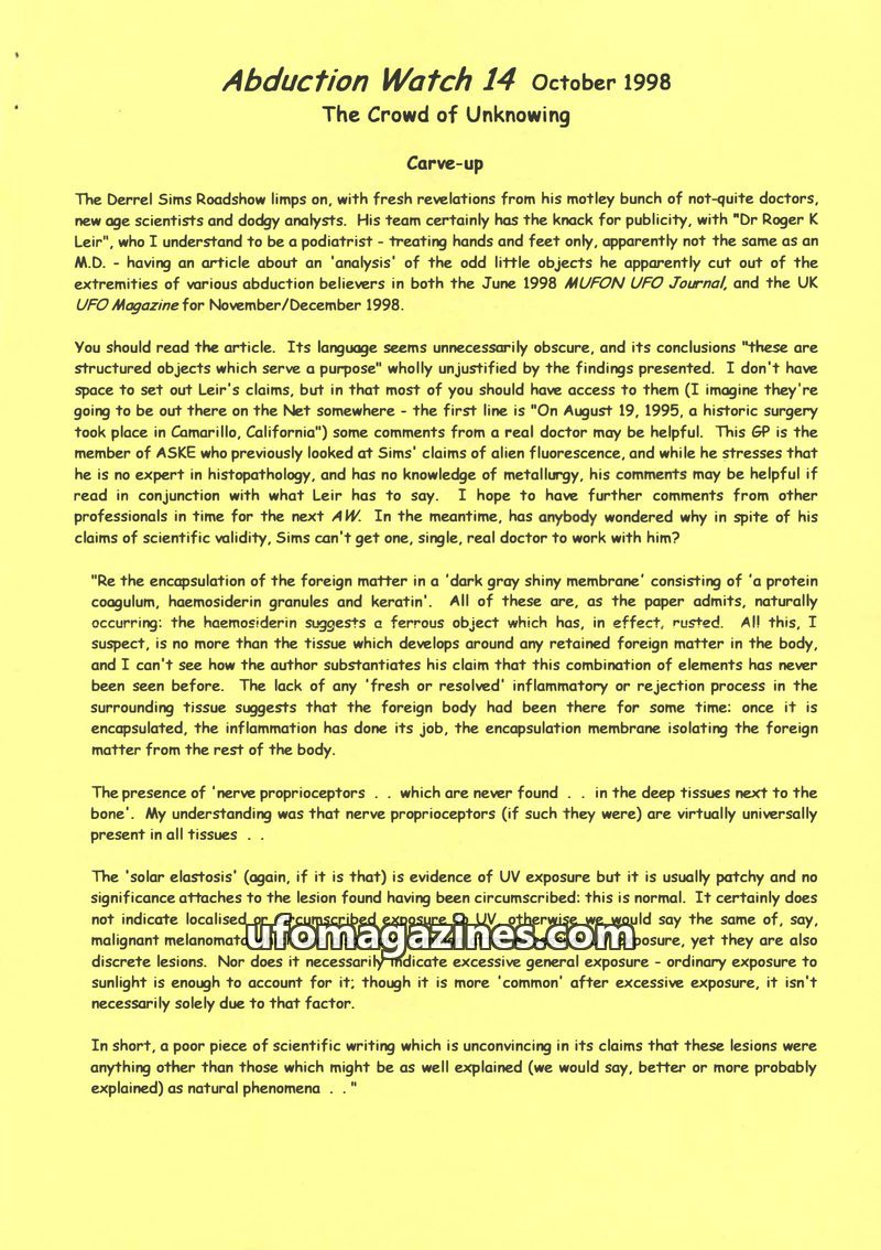 This issue of Abduction Watch critically examines recent claims in the UFO field. It scrutinizes 'Dr Roger K Leir's' analysis of alleged alien implants, presenting a GP's counter-a