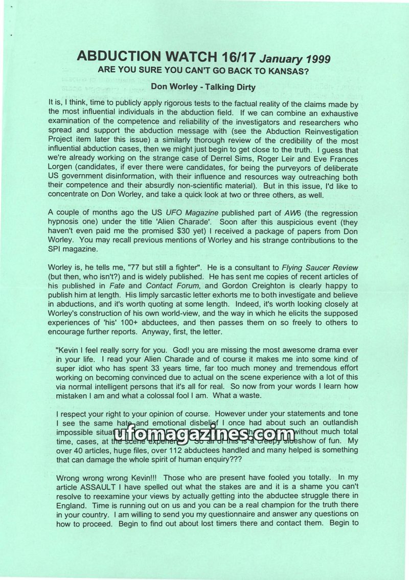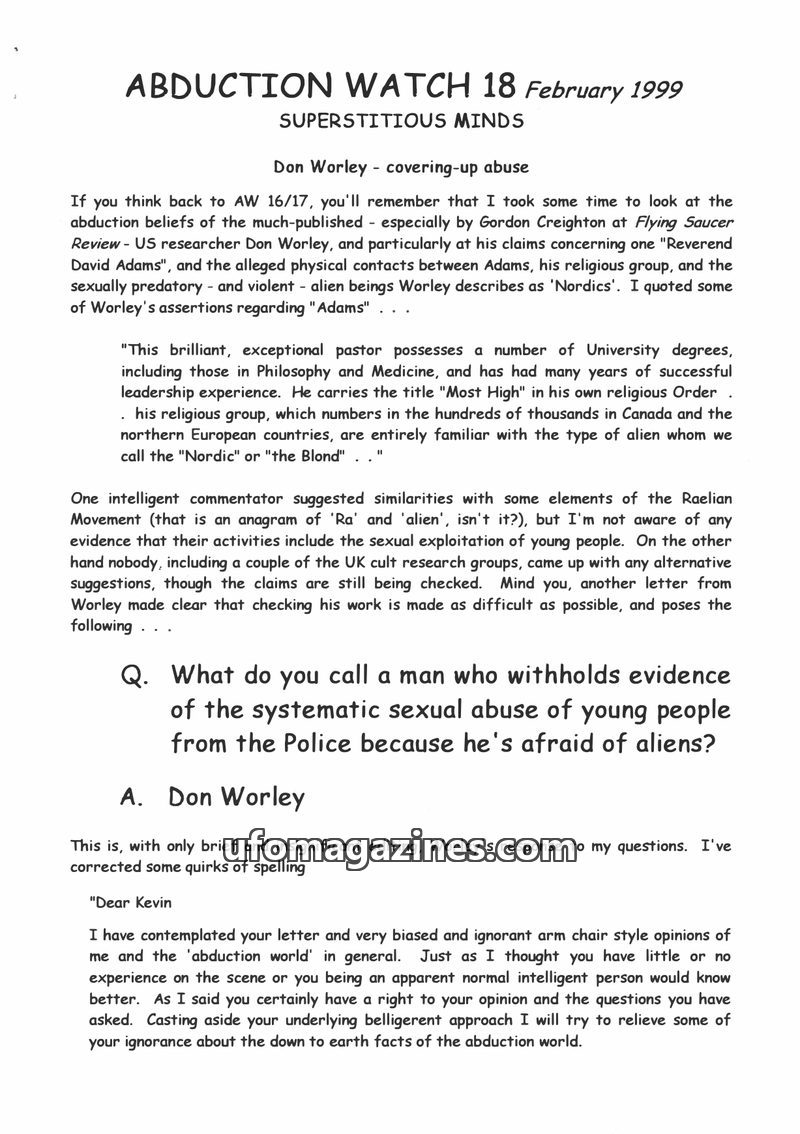 This issue of Abduction Watch critically examines the work of US researcher Don Worley, focusing on his claims about 'Reverend David Adams' and alleged alien sexual abuse. The auth