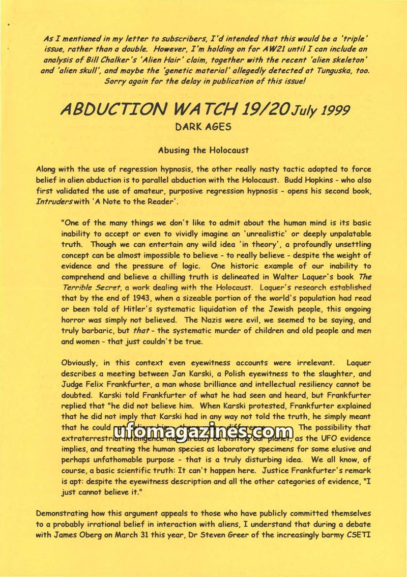 This issue of Abduction Watch critiques the comparison of alien abduction claims with the Holocaust, arguing it's an insult to victims. It examines how prejudice and the identifica
