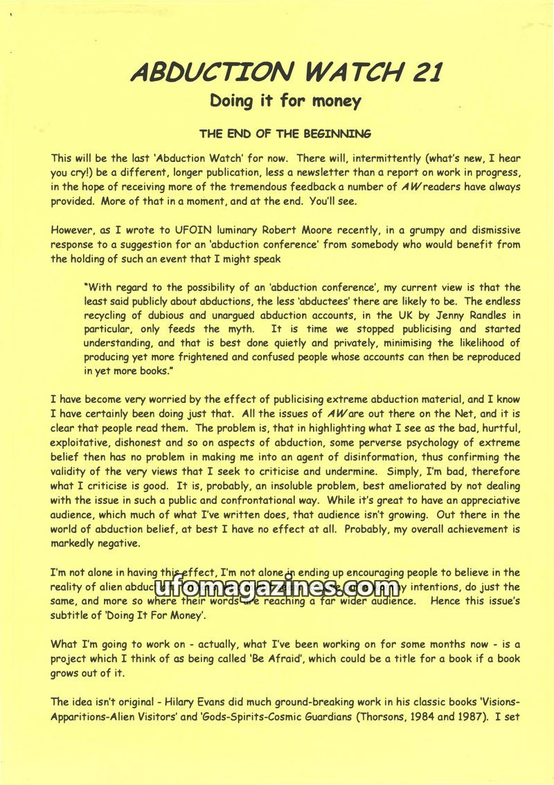 This final issue of Abduction Watch critiques the sensationalist and commercialized aspects of the abduction phenomenon, arguing that publicizing dubious accounts feeds myths and c
