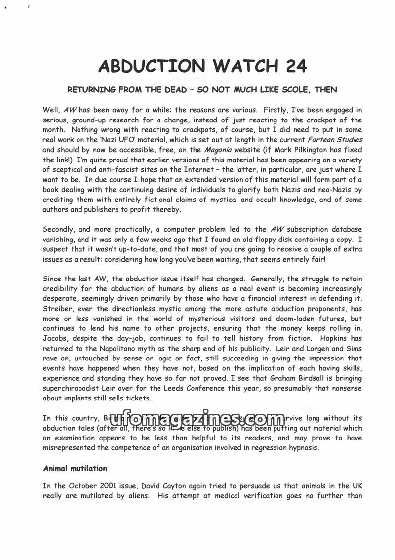 This issue of Abduction Watch critically examines claims made by UFO researchers, particularly regarding animal mutilations and alleged evidence of alien involvement. It questions