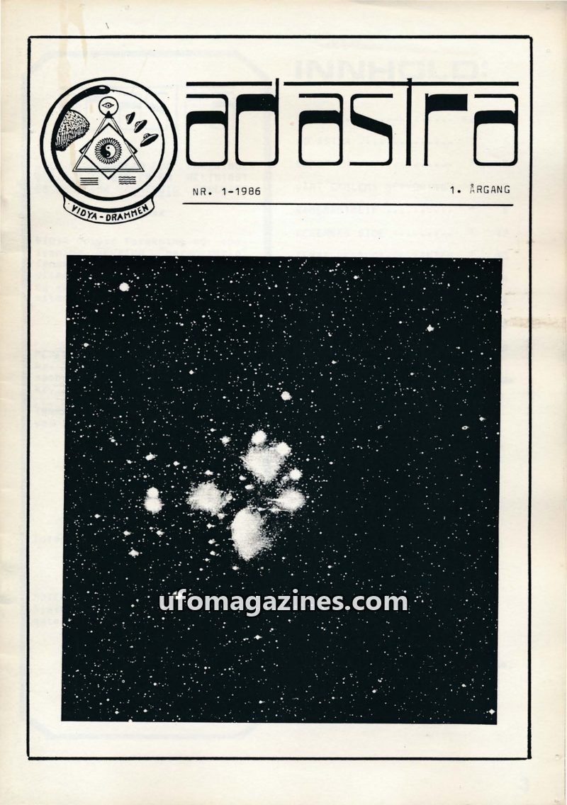 This issue of Ad Astra, published by Foreningen Vidya in 1986, focuses on UFO research, alternative medicine, and ancient mysteries. It features an article on UFO pioneer Josef All