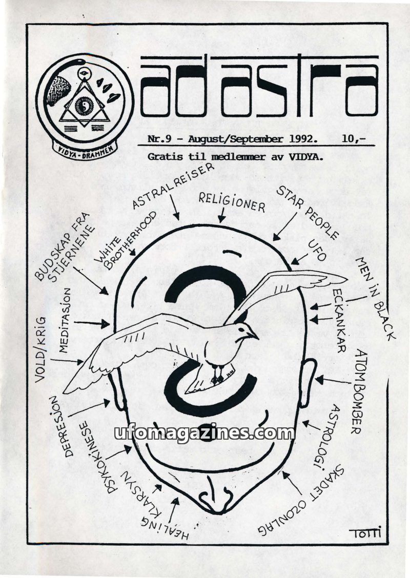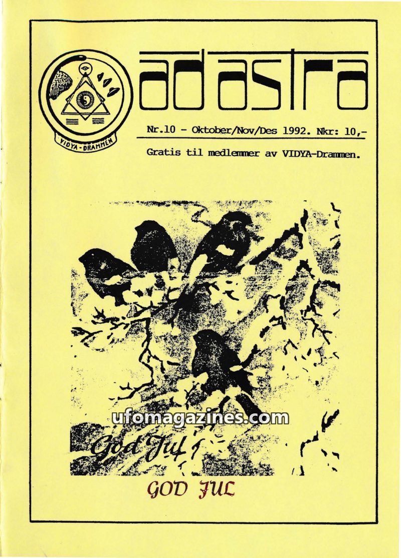 This issue of Ad Astra magazine, published by VIDYA-Drammen in late 1992, explores a range of topics including alleged experiments on cadaver weight loss, scientific and philosophi