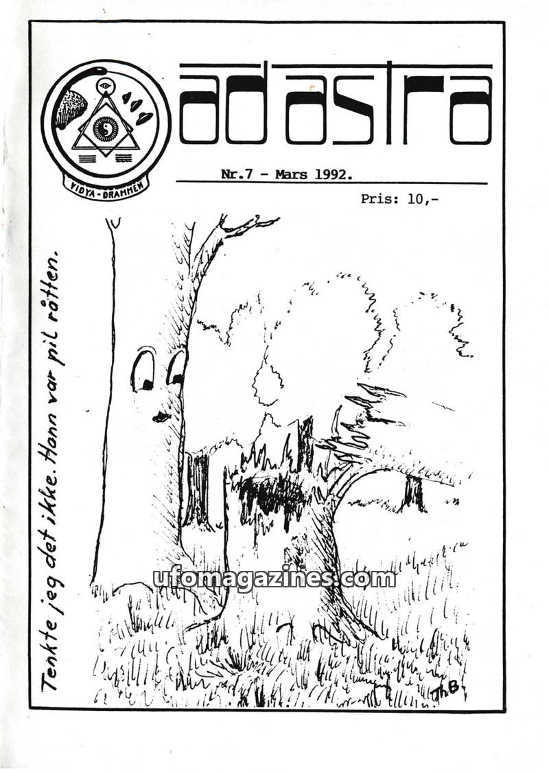 This issue of Ad Astra, dated March 1992, includes an editorial by Ole Jonny Brænne encouraging submissions and setting a positive tone. It features articles on UFOs, a review of E