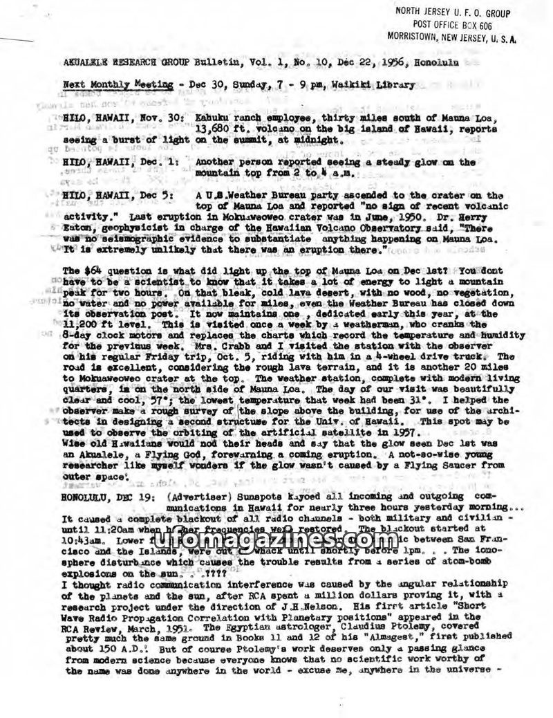 This issue of the AKUALELE RESEARCH GROUP Bulletin from January 20, 1957, details an increase in reported UFO sightings in Hawaii, including a light incident near Mauna Loa and spi