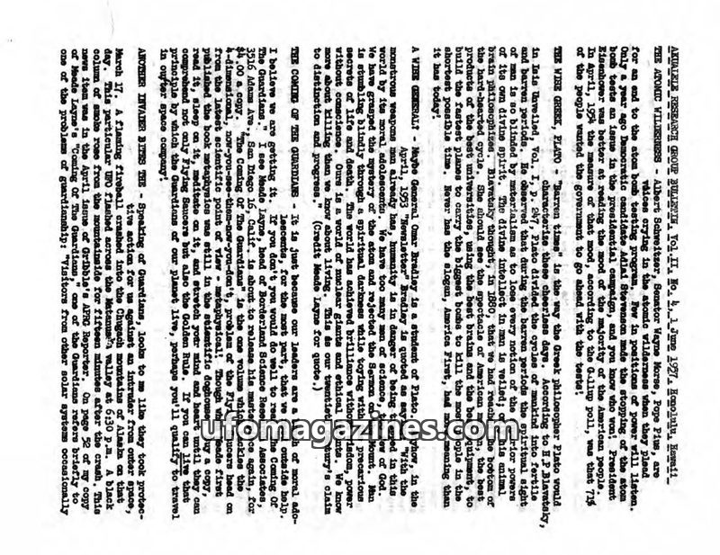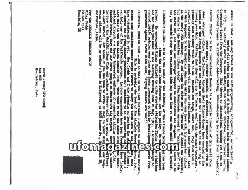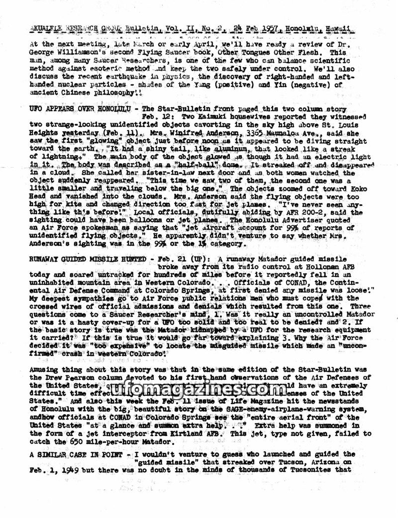 This issue of the AKUALFLE RESEARCH GROUP Bulletin covers a UFO sighting in Honolulu, a runaway Matador missile incident in Colorado, and discusses the nature of UFO research, dist