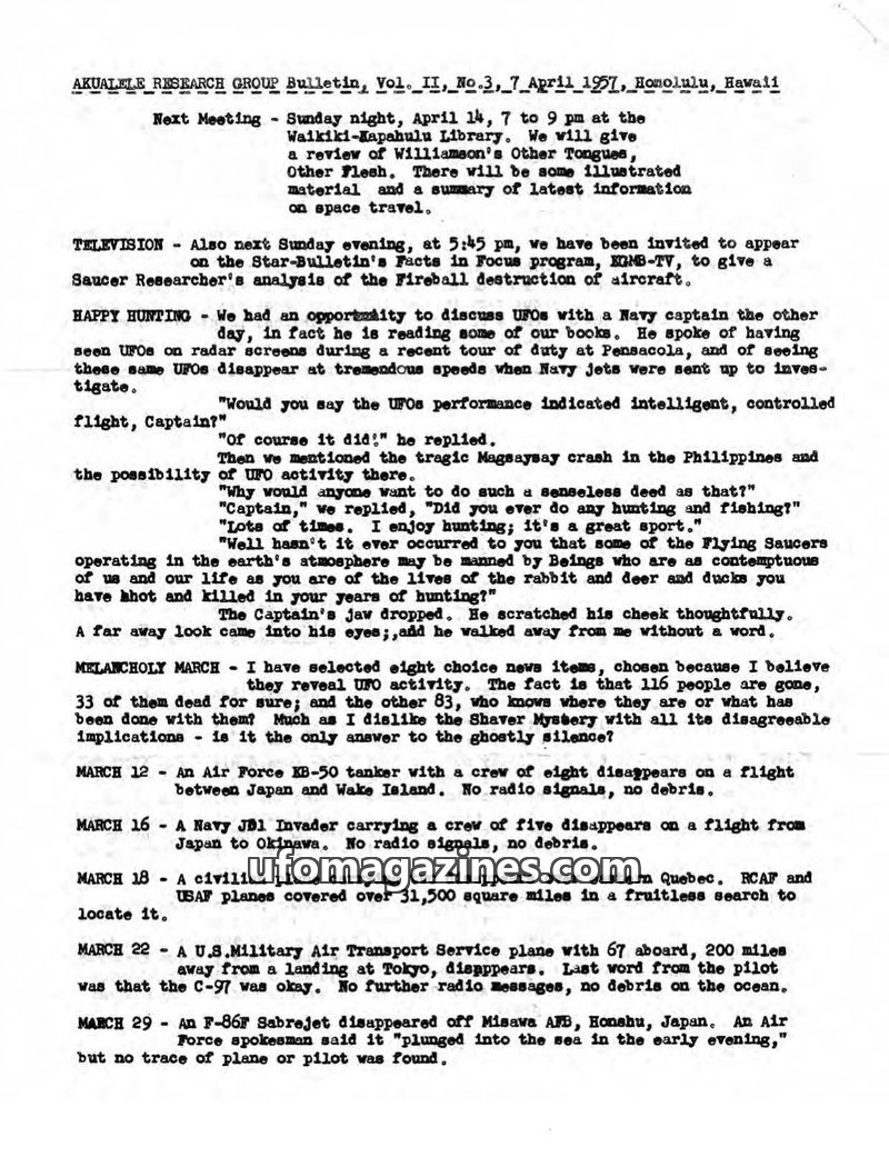 This issue of the AKUALELE RESEARCH GROUP Bulletin from April 1957 details numerous unexplained aircraft disappearances in March and early April, suggesting a connection to UFO act