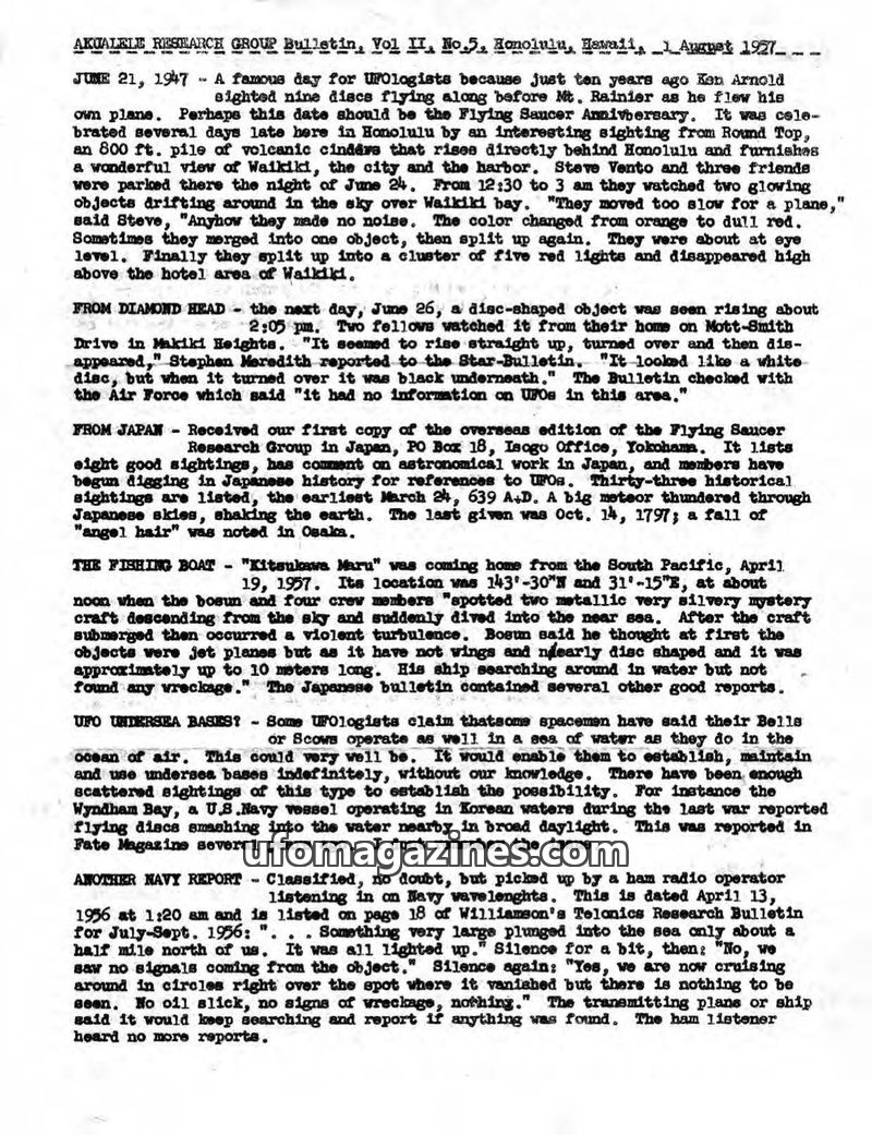 This issue of the Akualele Research Group Bulletin from August 1, 1957, details numerous UFO sightings from June 1947 to April 1957, primarily in Hawaii and Japan. It includes repo