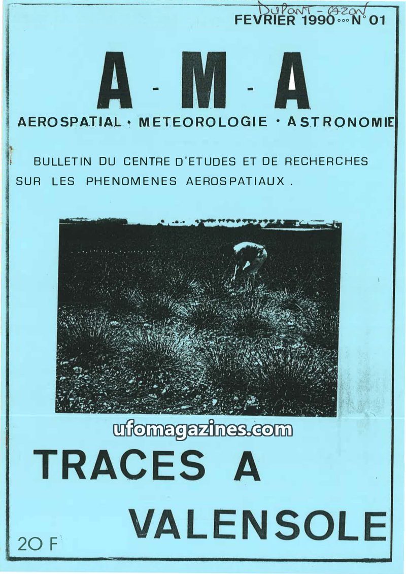 This issue of A.M.A. (Aerospace, Meteorology, Astronomy) bulletin from CERPA focuses on unidentified aerospace phenomena. It details the 'Traces a Valensole' case and a series of U