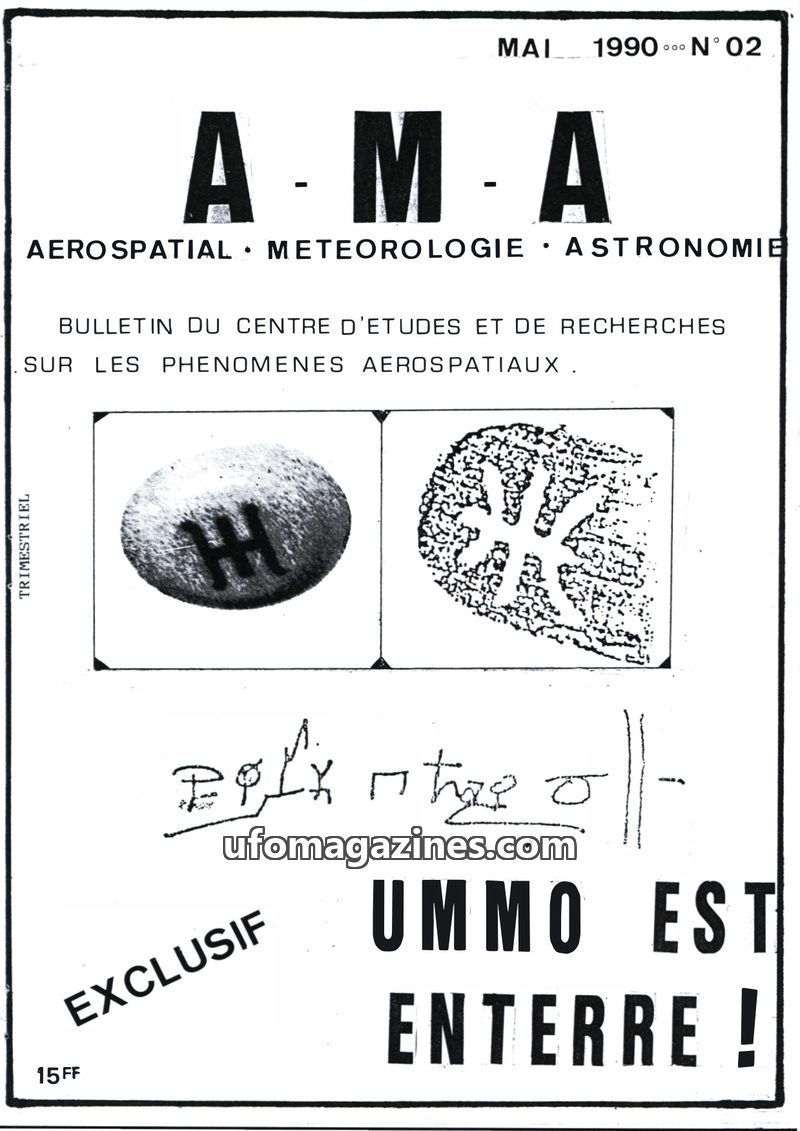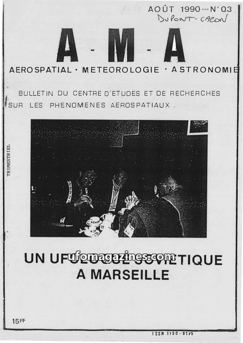 This issue of AMA magazine details the visit of Soviet ufologist Boris Chourinov to Marseille in November 1990. Chourinov shared insights into the evolving landscape of Russian ufo