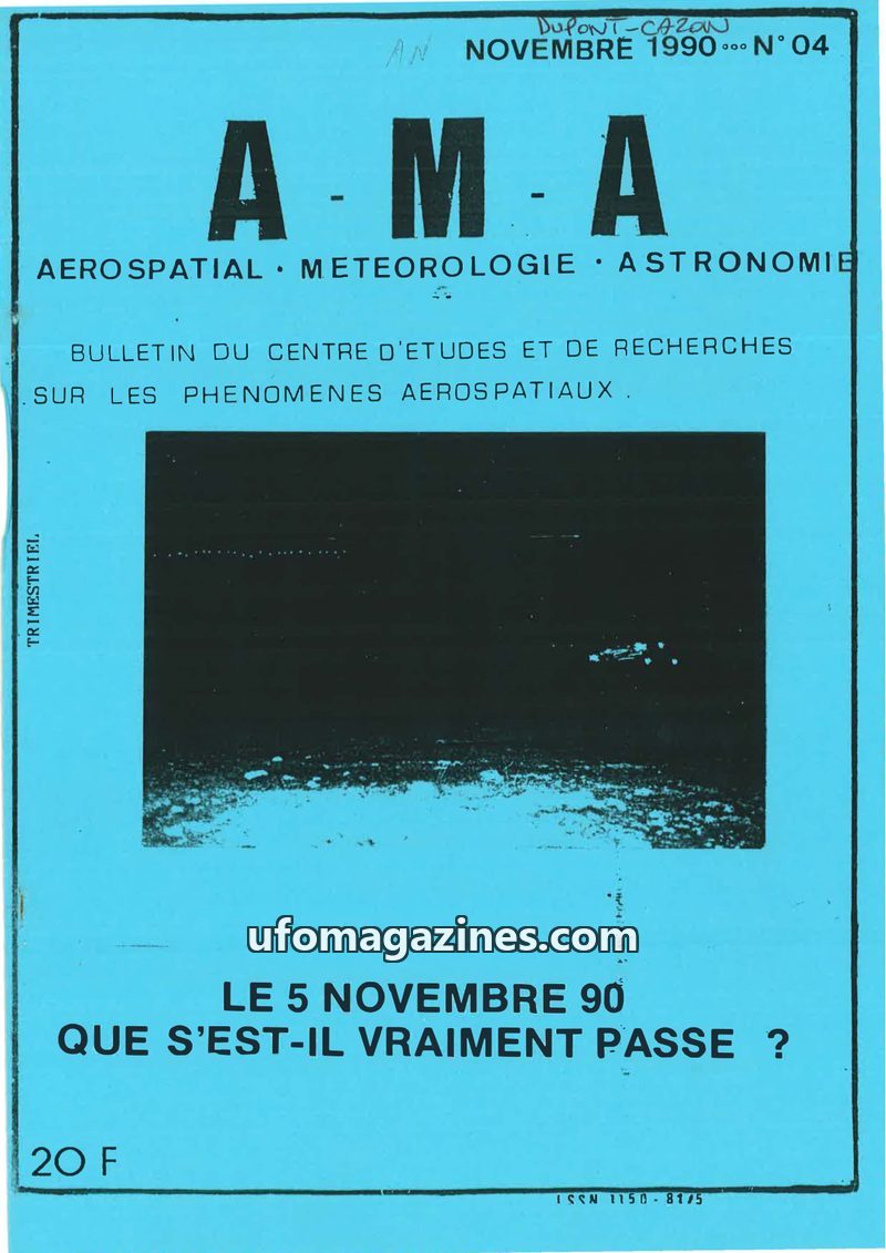 This issue of AMA magazine focuses on the wave of triangular luminous phenomena observed in Europe, particularly on November 5, 1990. It details witness accounts from France, inclu